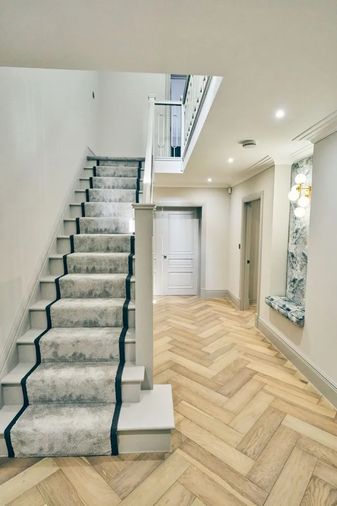 A client visited WoodFloors4U with a vision of creating a herringbone floor that will be easy on the eye while making a huge statement inside his home. He wanted a light grey herringbone parquet floor splashed with a natural/invisible effect oak to coincide with his light and bright interior décor. This is what our team came up with and what a beauty it is.
