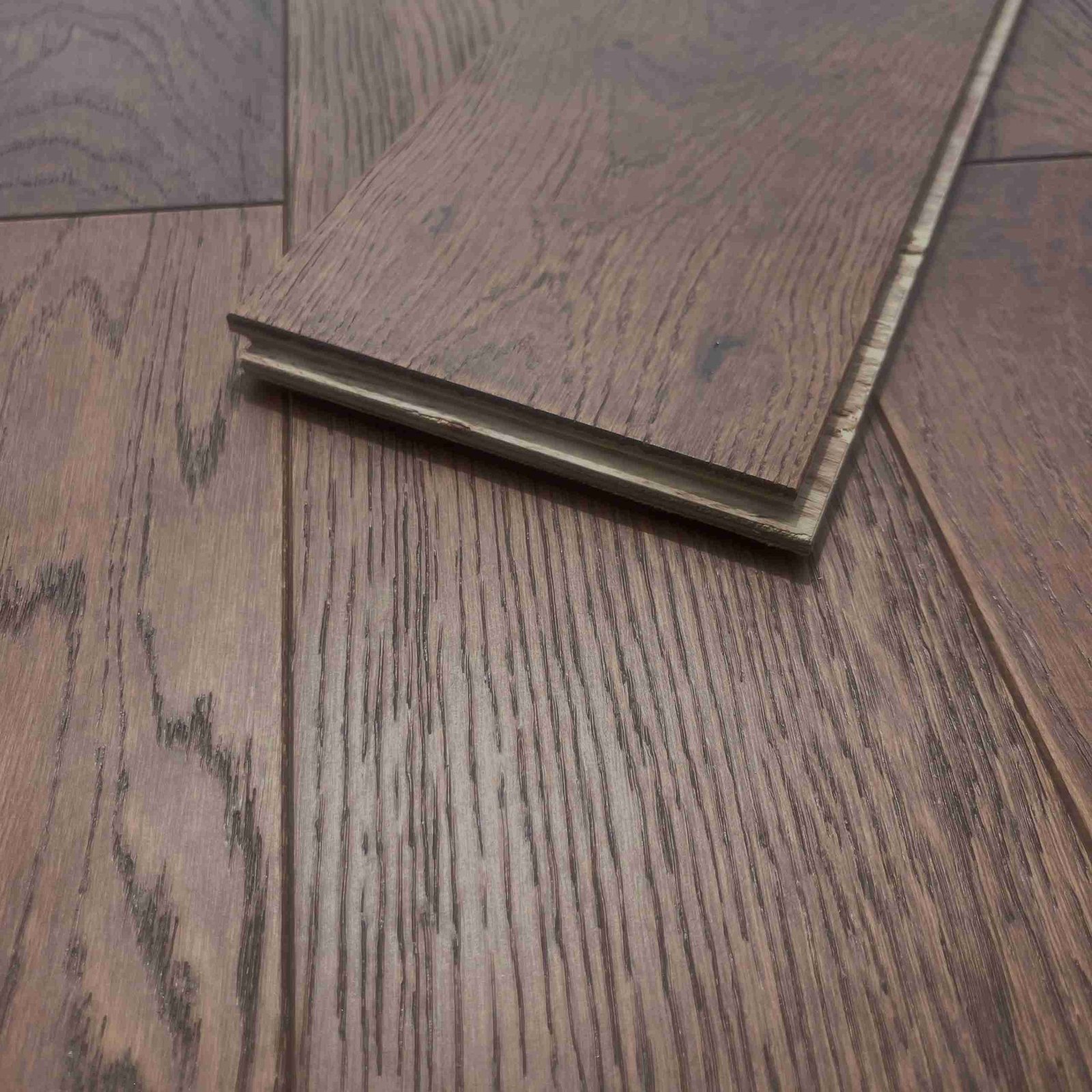 Our gorgeous Chocolate oak Brushed Lacquered wood flooring looks almost good enough to eat. Its rich, dark cocoa tones will add warmth and style to any room. Each individual plank has been brushed to further intensify the natural grain, knots and whorls within the wood, while a lacquered finish helps to protect and enrich every piece. If you are looking to create a dramatic feature, this is a wood that certainly has the wow-factor and which will become a real talking point. Perfect for any room, but will look especially good in living rooms or bedrooms with antique or dark furnishings and luxury fabrics.