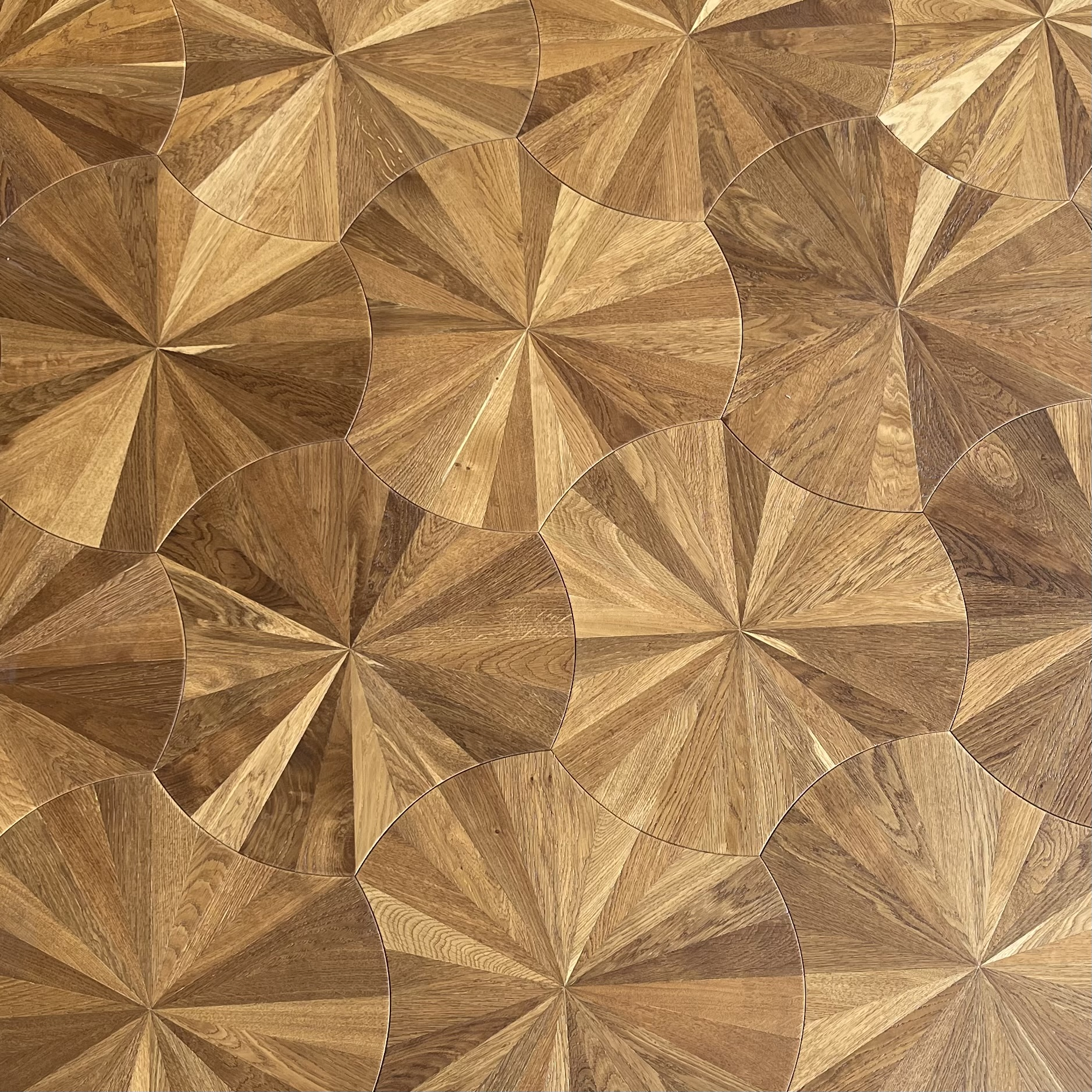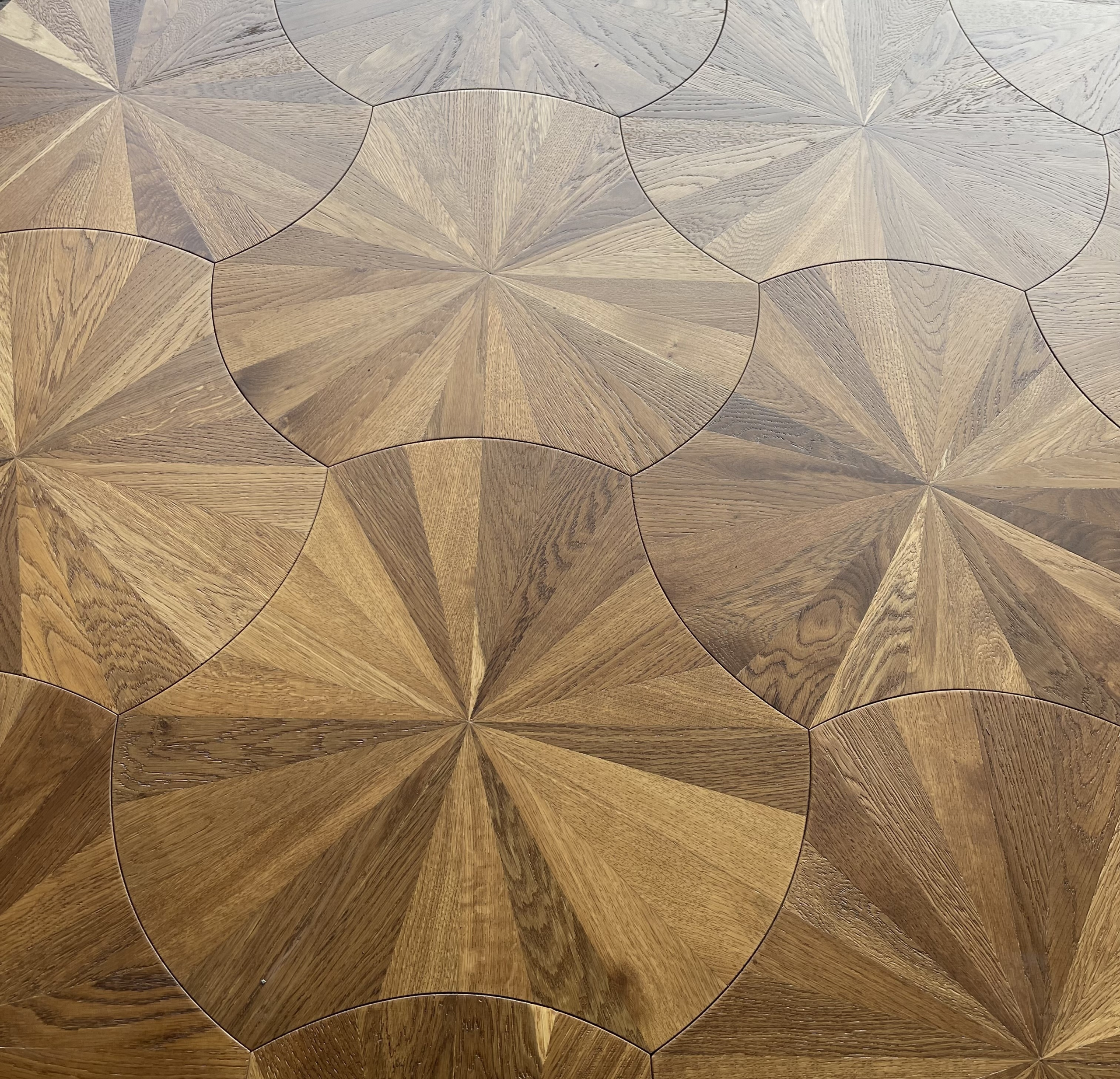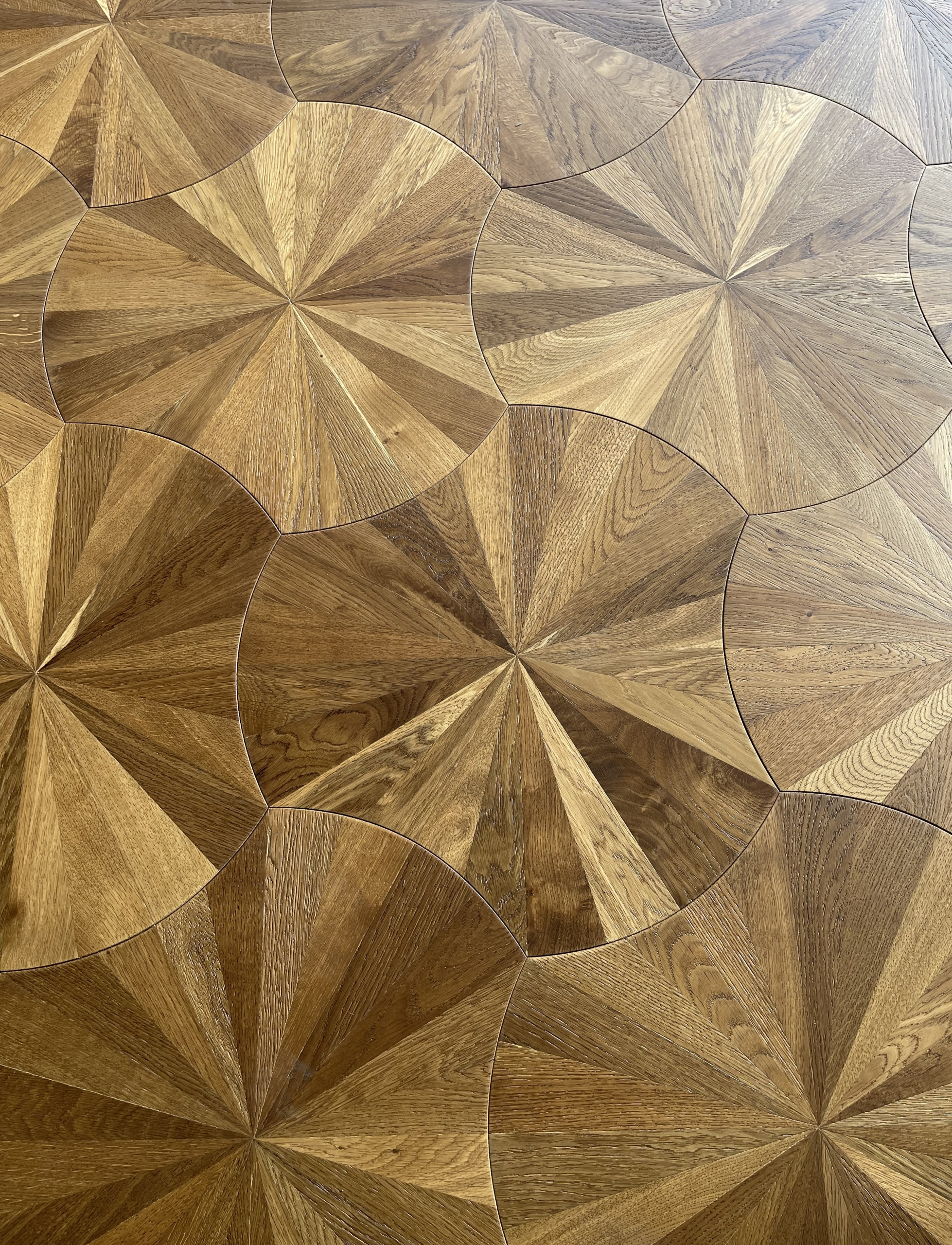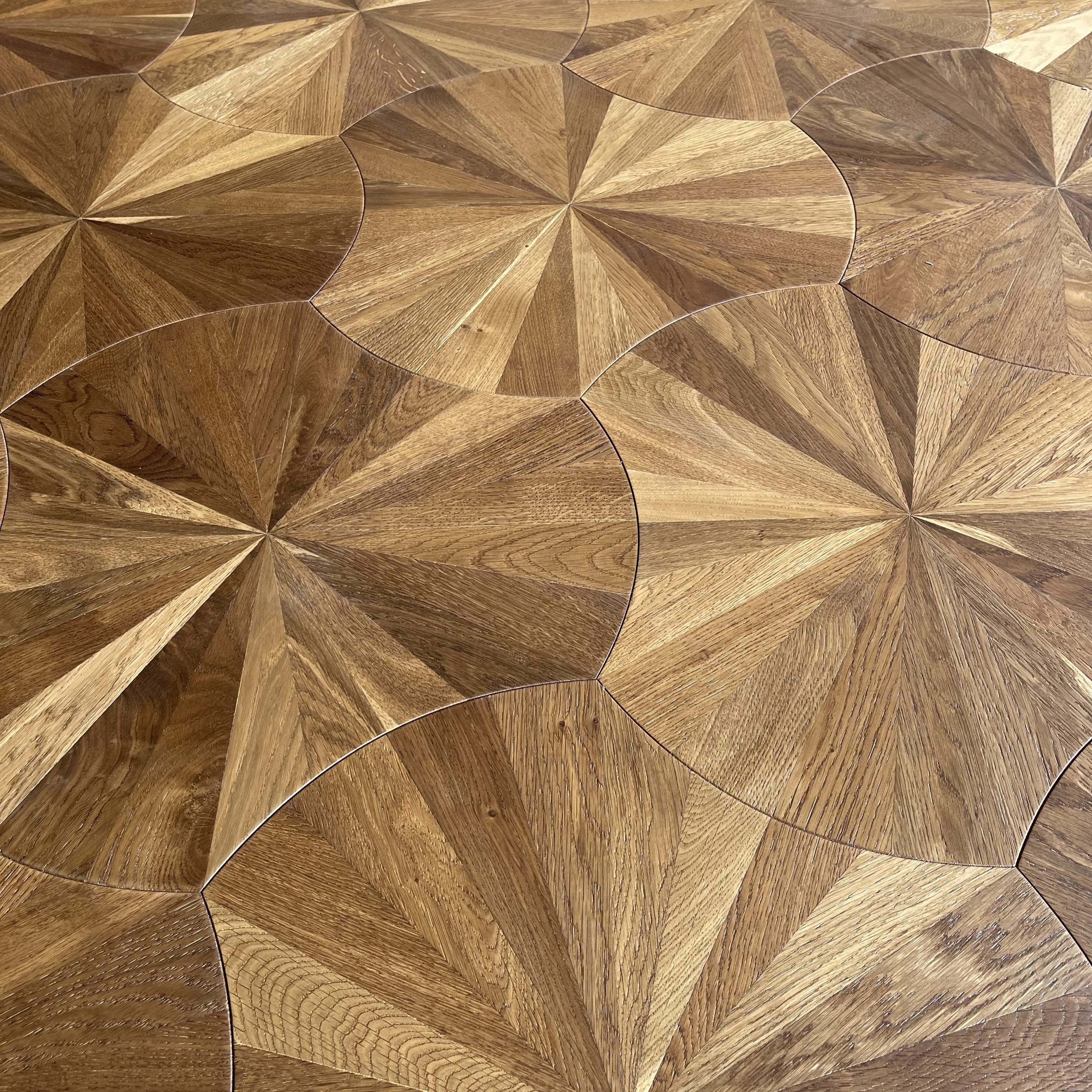 Bring timeless luxury into your interiors with the Architectural Smoked Lotus Panel, a bespoke smoked oak parquet designed for flooring. Each panel is crafted with precision, showcasing a lotus-inspired geometric pattern that combines natural oak beauty with architectural elegance.