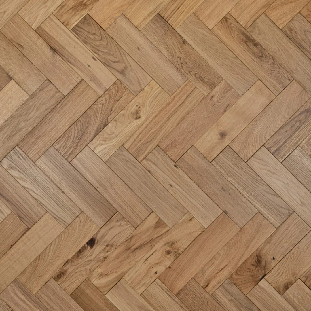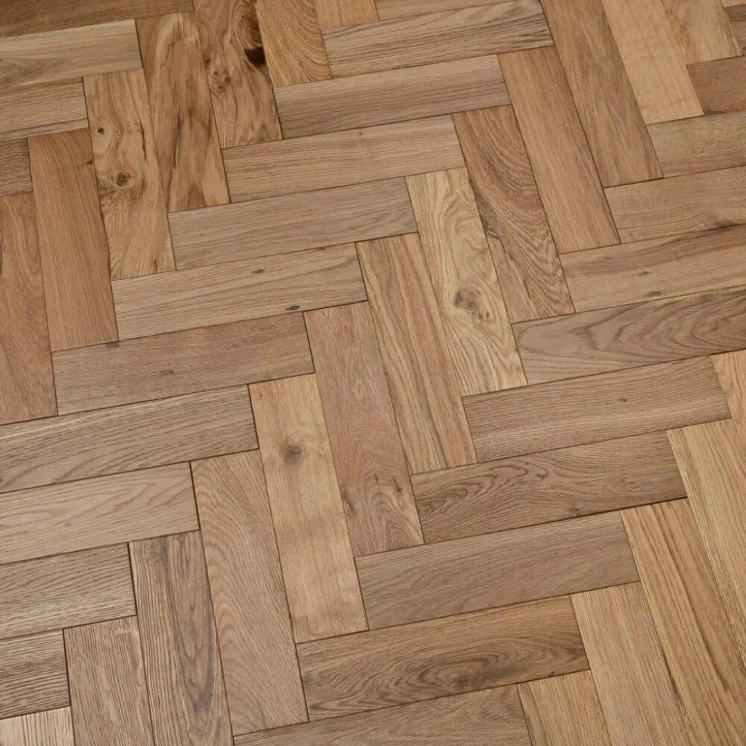 Natural Oak parquet flooring, with a solid oak 3mm wear layer with a wire brushed surface to reveal the true natural beauty of oak, sealed with a long lasting UV protective lacquer for a truly stunning finish.